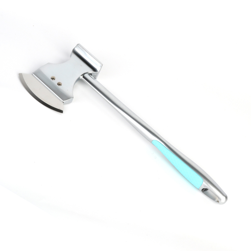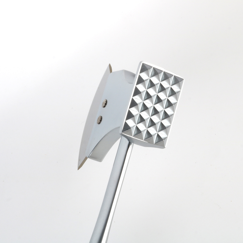 Alat kabeh-ing-siji kang serves loro minangka desain anyar zinc alloy meat tenderizer lan pizza cutter, dawane 25 cm. Ing mburi ngarep dipérang dadi loro lumahing fungsi: siji kanggo meat tenderizer lan liyane kanggo pizza cutter.The nangani dirancang karo wangun busur optimized lan bagean saka nangani cedhak genggeman iku luwih kenthel kanggo wong diwasa saka ABSA cushi digawe kuwat. buntut gagang kanggo nyuda pain palm lan nambah comfort sak suwene nggunakake.