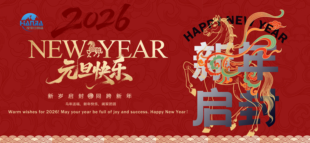 1 Januari 2026, nandhani festival tradisional Tionghoa ing Dina Taun Anyar. Saben taun ing wektu iki, kita njupuk kesempatan kanggo nggambarake prestasi lan kekurangan kita, ngarep-arep bisa nggawa rejeki ing taun anyar lan entuk asil sing luwih apik tinimbang ing taun kepungkur. Taun 2025 wis rampung lan Jinhua Hanjia Commodity Co., Ltd. katon maneh ing taun kepungkur. ing manufaktur lan perdagangan impor-ekspor, wis ngadhepi taun tantangan sing dipengaruhi dening kahanan ekonomi global.