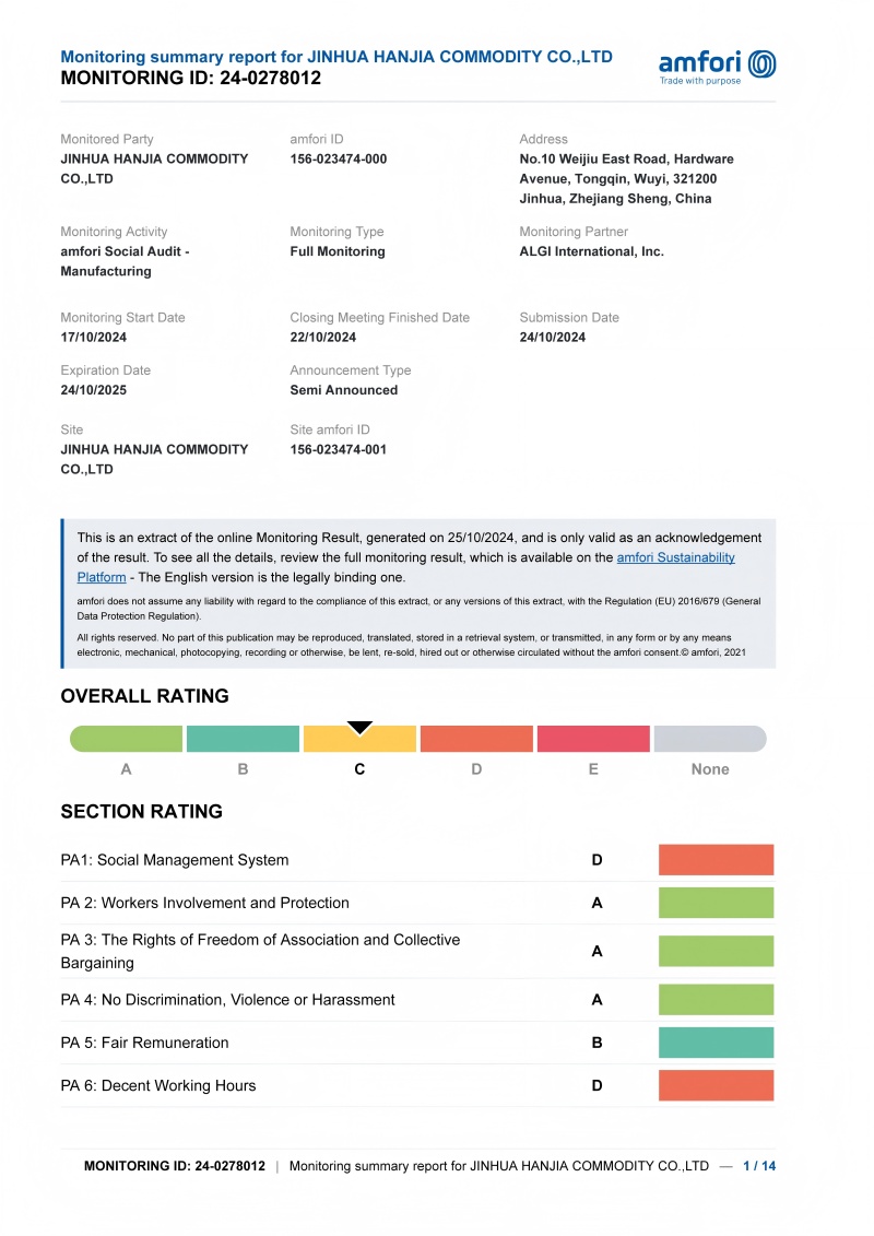 Ing 2025,Jinhua Hanjia Komoditas Co, LtdSukses entuk sertifikasi level C Cahya ing Klasifikasi Internasional Program standar (ICS), sing ditindakake dening agensi pemriksaan Eropa nomer telu sing ditunjuk dening koperasi Esseigne. Sistem sertifikasi iki kalebu papat undakan: a, b, C, lan D. minangka anggota saka kamar Perdagangan Sosial organisasi, "kahanan pekerjaan lan safety, lan upah dokumentasi.